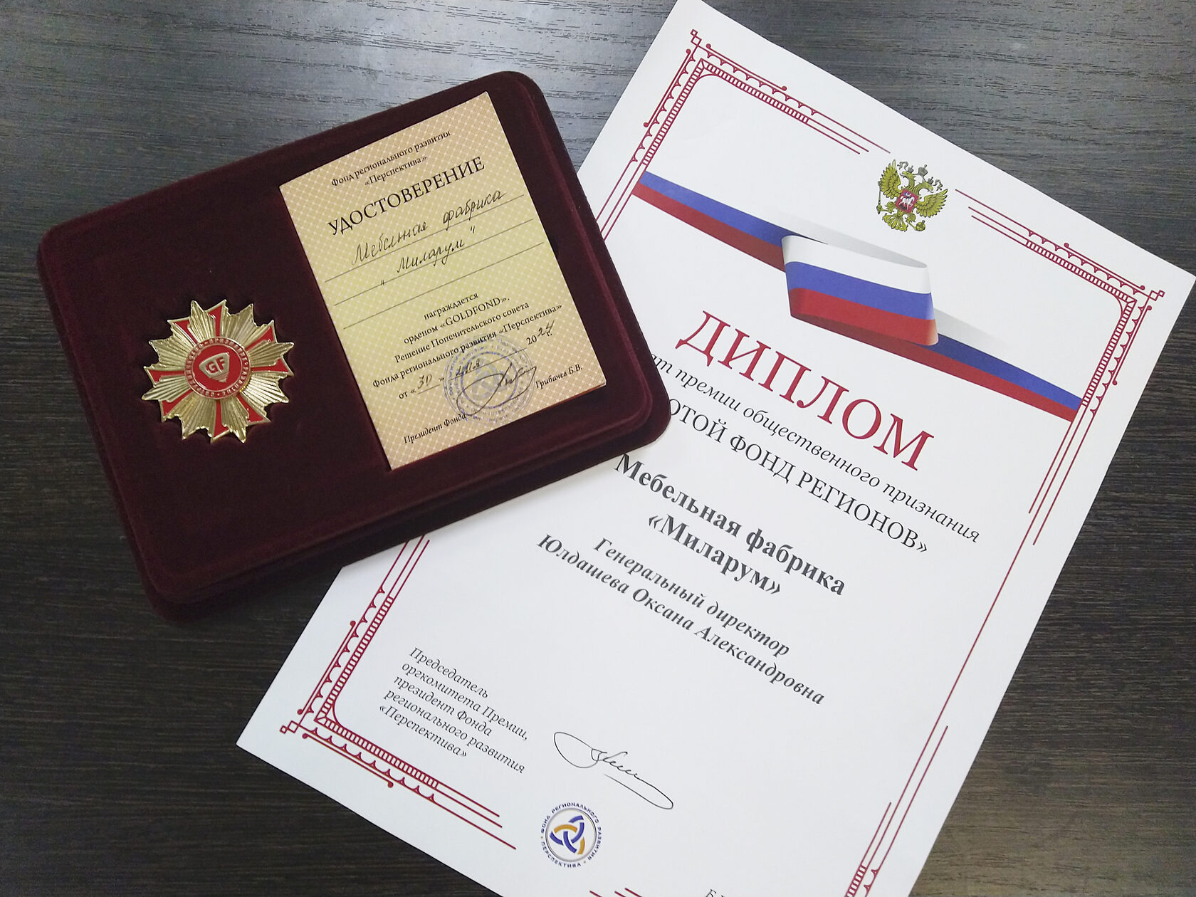 Мебельная фабрика «Миларум» стала лауреатом премии общественного признания «Золотой фонд регионов». В торжественной обстановке в администрации города Лесного директору фабрики Оксане Александровне Юлдашевой вручены Диплом лауреата и орден предприятию «Goldfond»..