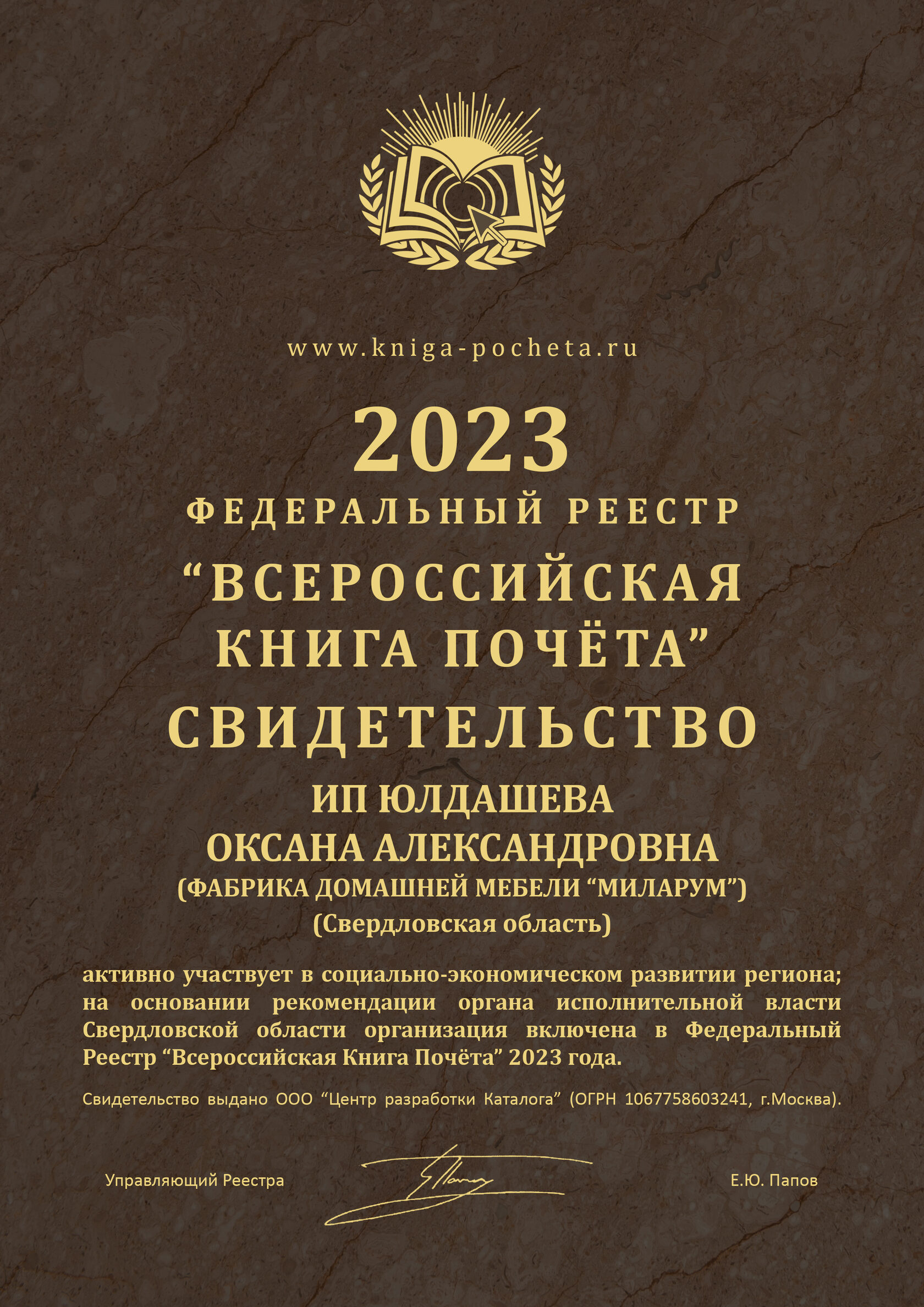 По итогам 2023 года фабрика «Миларум» включена в Федеральный Реестр «Всероссийская Книга Почёта».